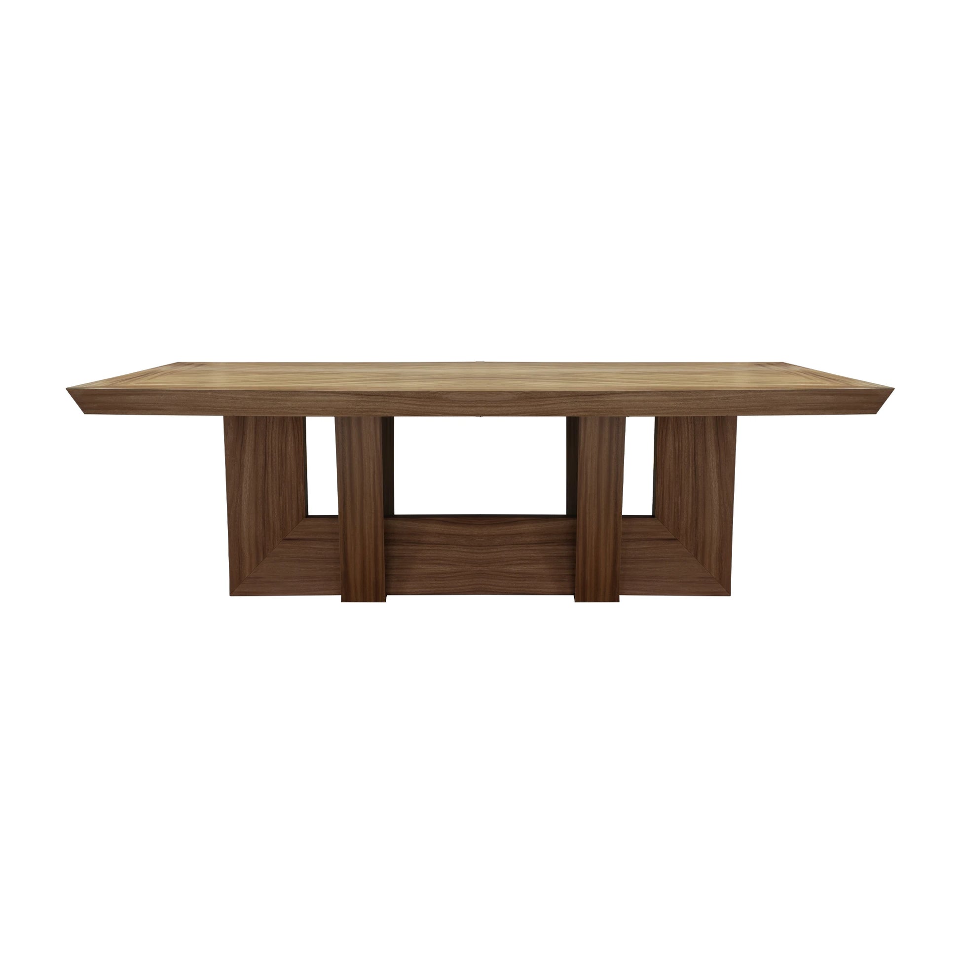 La Mesa Comedor Cartagena es una pieza que celebra la carpintería geométrica con una presencia robusta y unificada, ideal para un comedor moderno. La mesa destaca por su tapa rectangular y gruesa, cuyo diseño es un verdadero foco visual: las vetas de la madera están dispuestas en un patrón chevron o estrella central, creando un dinamismo geométrico que enmarca la superficie. La base complementa la cubierta, compuesta por pedestales angulares que proporcionan una estabilidad visual. La Mesa Comedor Cartagena es la elección perfecta para quienes buscan un diseño moderno, un carácter firme y una mesa que resalte la belleza de la madera trabajada con arte.