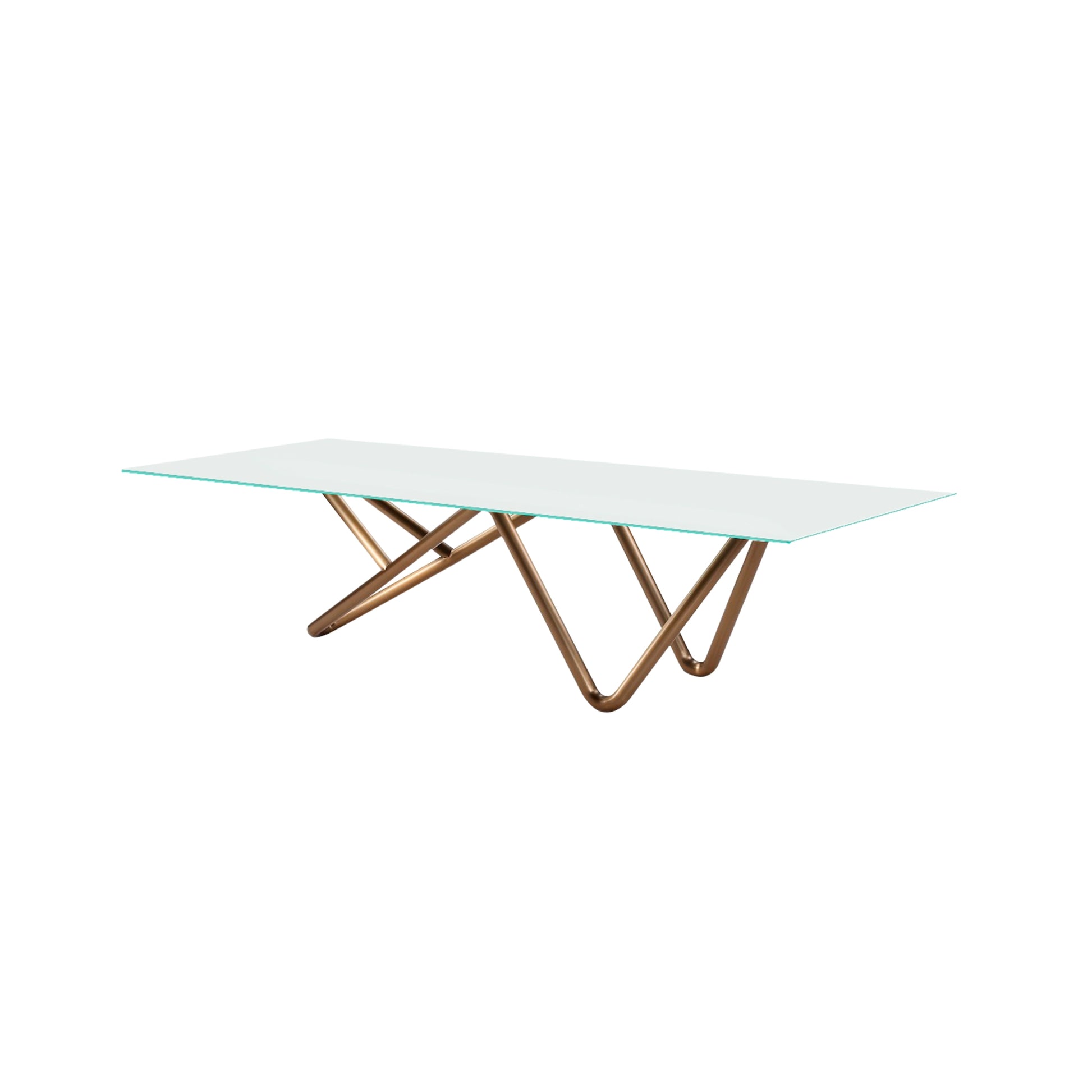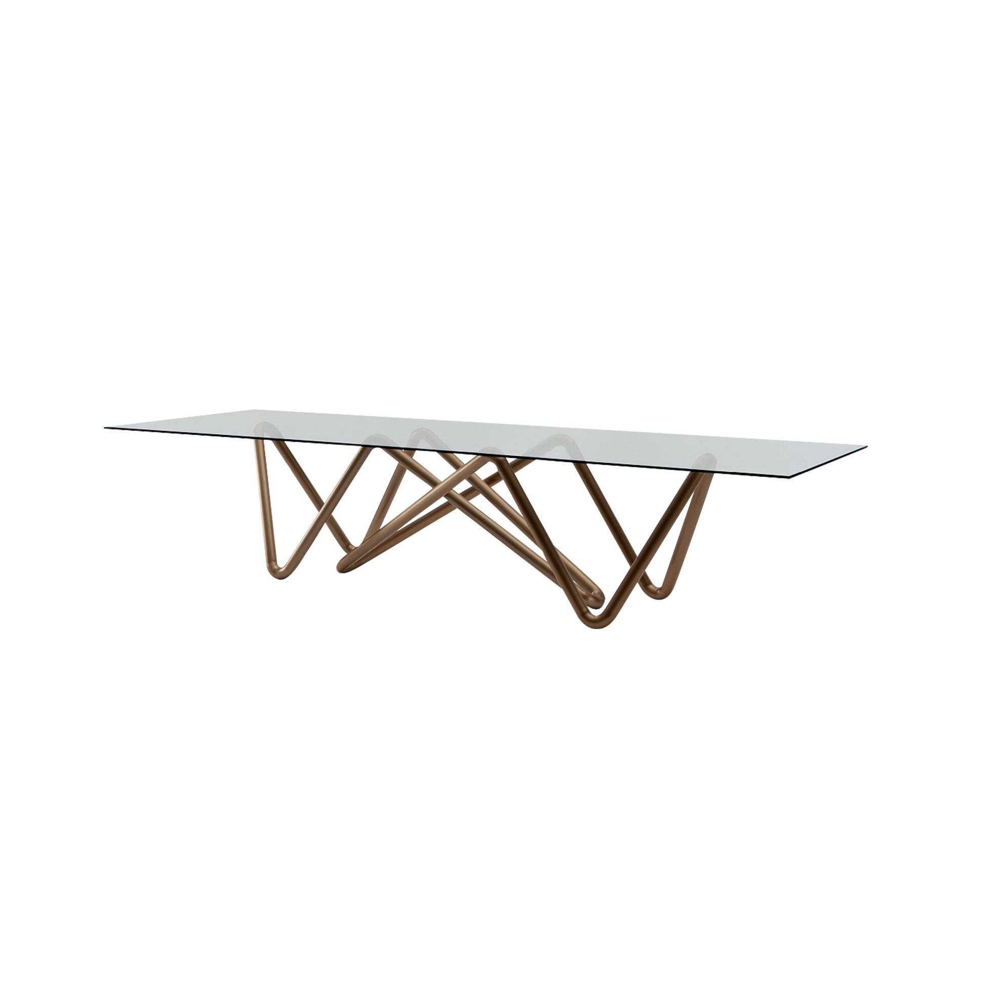 La Mesa Comedor New York es una pieza de diseño que se distingue por su base metálica escultural y dinámica, elevando la mesa a la categoría de arte funcional. La base es el verdadero punto focal, construida con tubos metálicos delgados en un tono bronce. Estos tubos se curvan y entrelazan de manera compleja, creando un patrón geométrico y fluido que simula movimiento y ligereza. Es la elección perfecta para comedores que buscan un diseño vanguardista, un lujo industrial y una pieza central que desafía lo convencional.