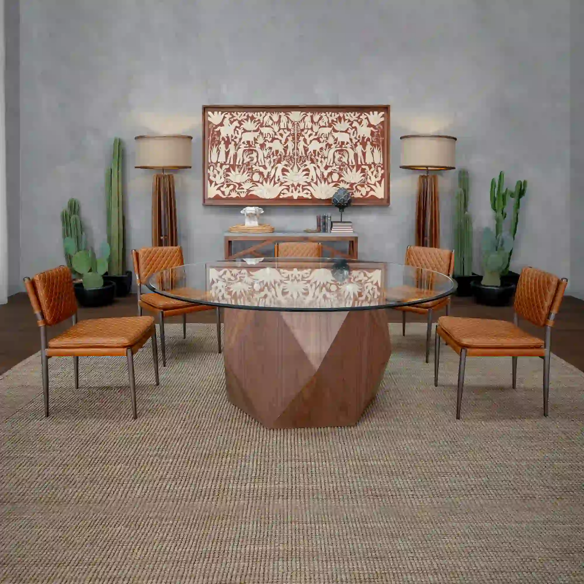 La característica más notable de este comedor es su base central monolítica y escultural, diseñada con un patrón de facetas geométricas que imitan la forma de un diamante tallado o un poliedro. Esta base, con un acabado de madera oscura y rica, la cual se equilibra perfectamente con la ligereza de su cubierta redonda de cristal transparente, la cual permite que la impresionante carpintería facetada sea visible desde cualquier ángulo. El diseño circular fomenta la conversación y el flujo, mientras que la base facetada añade una dimensión artística inigualable. La Mesa Comedor Bron es la elección ideal para espacios que buscan inyectar un lujo moderno y una personalidad única a la experiencia de comer.