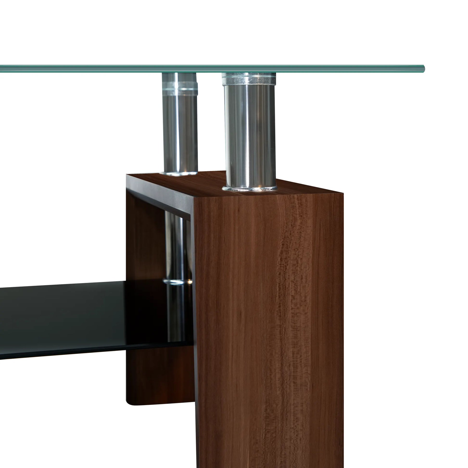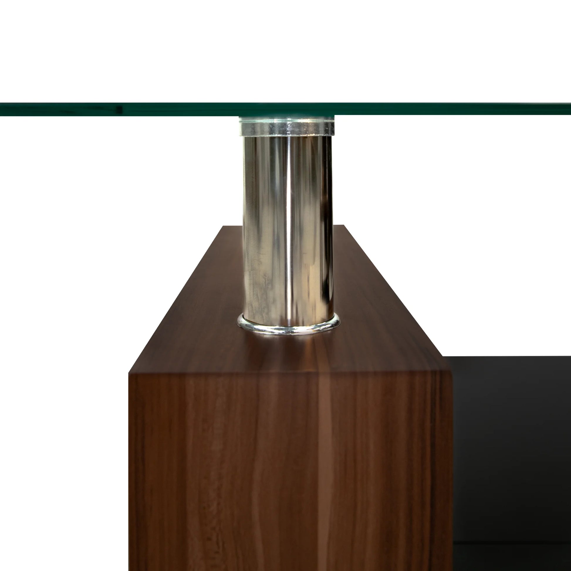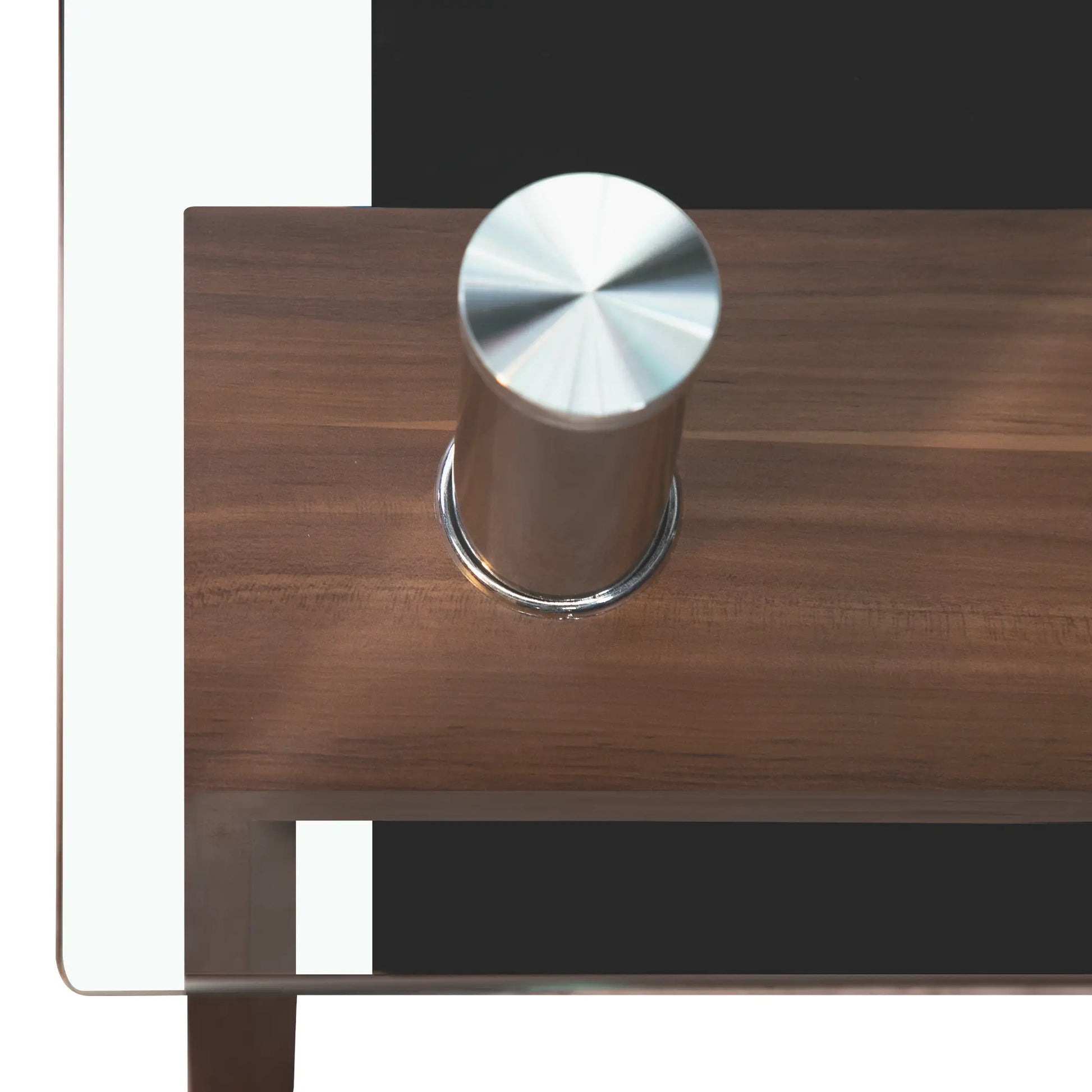 La Mesa de Centro Puentes es una pieza de diseño que se inspira en la arquitectura moderna y la ingeniería estructural, creando un mueble auxiliar visualmente cautivador. La cubierta superior es de cristal templado transparente, lo que permite una vista completa de la estructura interna. Un estante inferior de cristal negro proporciona funcionalidad adicional y añade un fuerte contraste de color. La Mesa de Centro Puentes es la elección ideal para quienes buscan un diseño industrial-moderno, compacto y funcional, que combine la solidez de la madera con la ligereza del cristal y el brillo del metal.