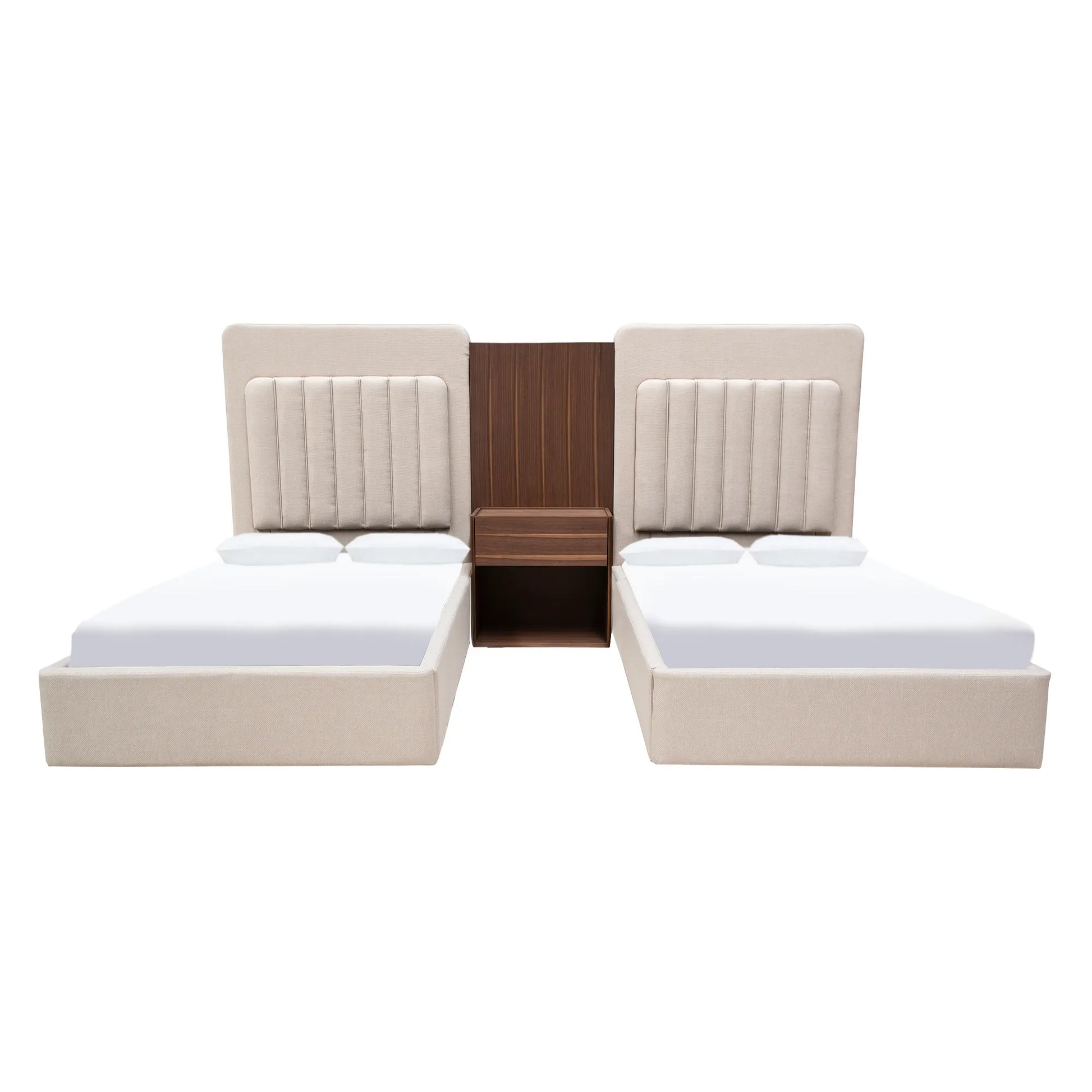 El Set de Camas Novi ofrece una solución de dormitorio elegante y funcional, definida por su diseño simétrico, sus líneas limpias y la integración inteligente de almacenamiento. Las cabeceras individuales son la clave del diseño: tienen una forma rectangular con esquinas redondeadas y un panel central verticalmente acanalado (channel tufting) que añade una textura lujosa y un detalle Art Déco sutil a la tapicería. El Set Novi es ideal para dormitorios que buscan un diseño moderno, un uso inteligente del espacio y una estética de lujo discreto y perfectamente simétrico.