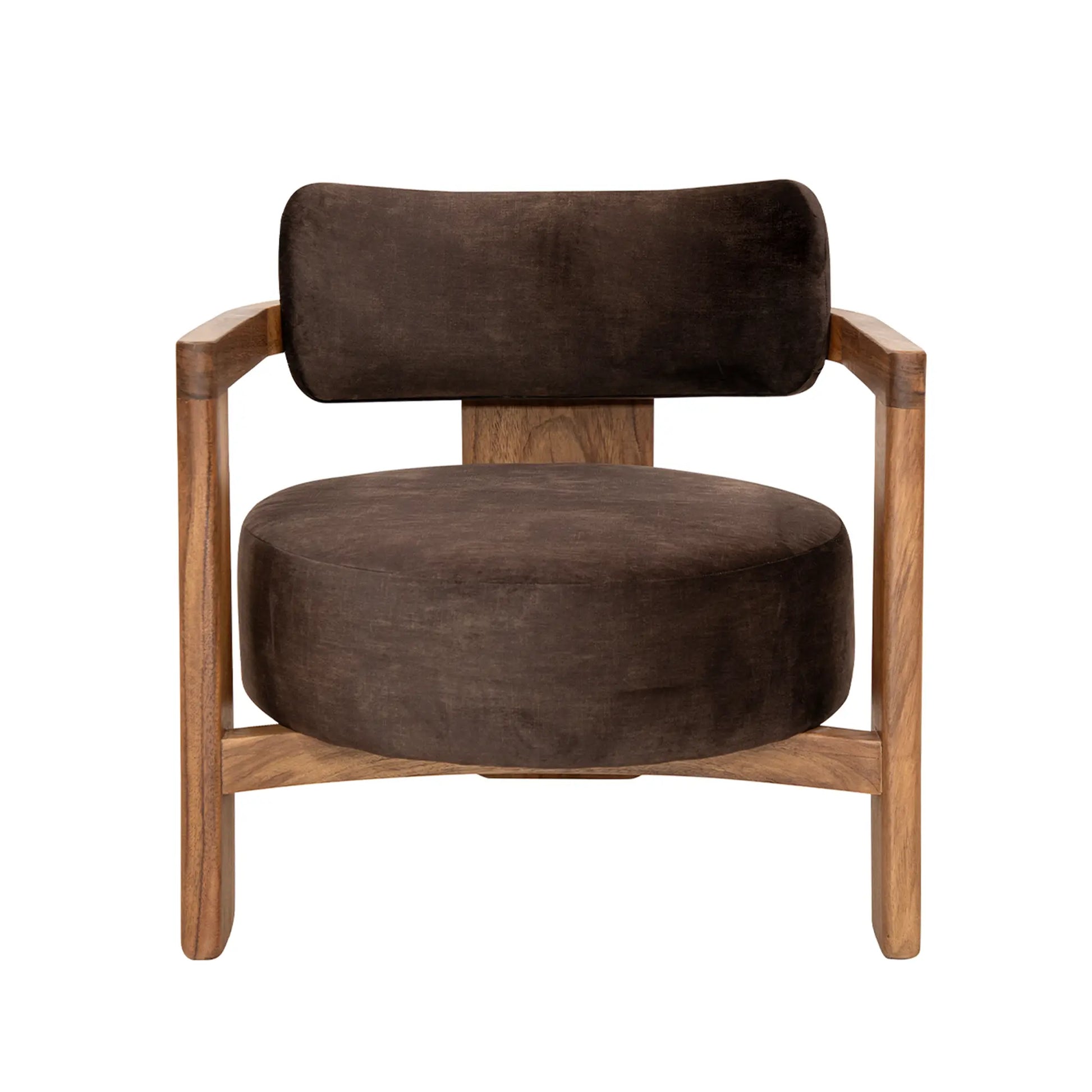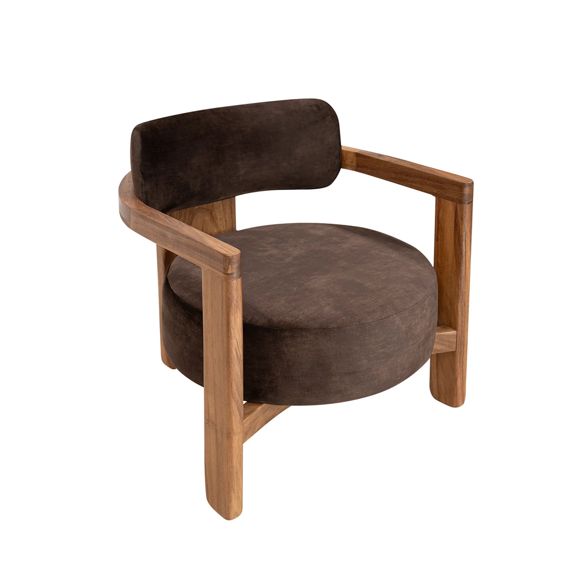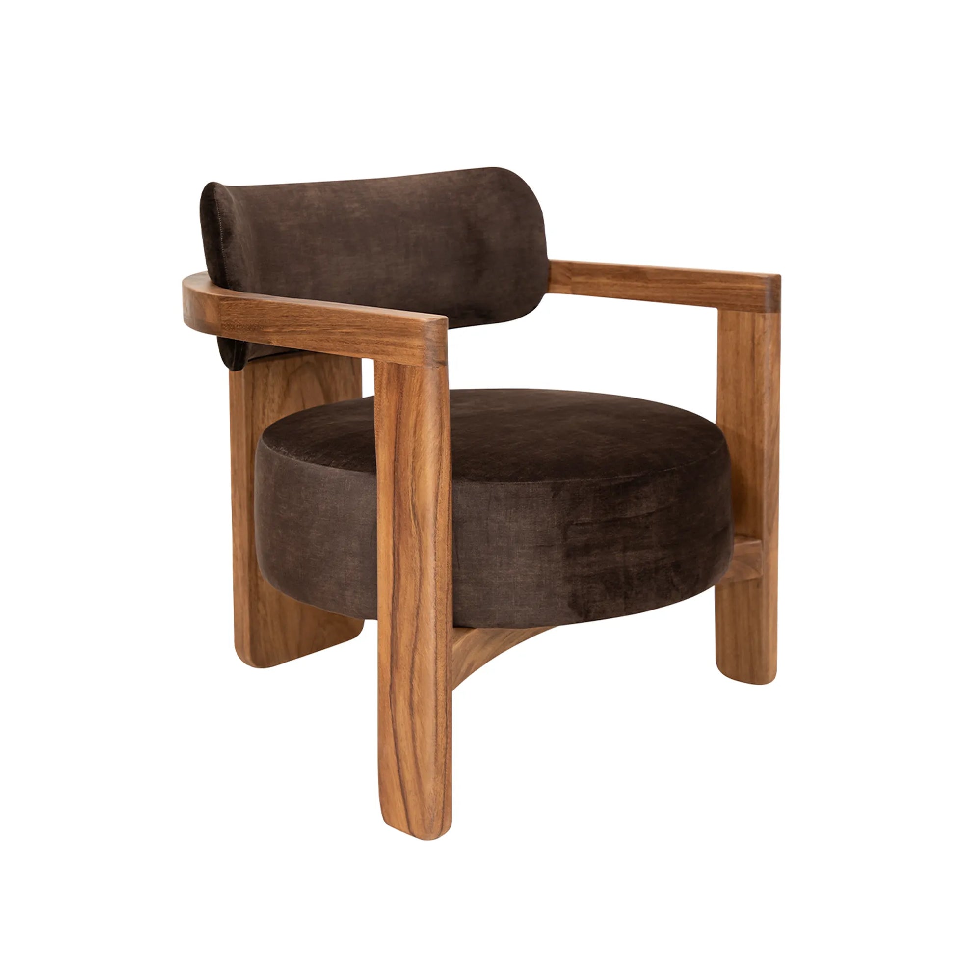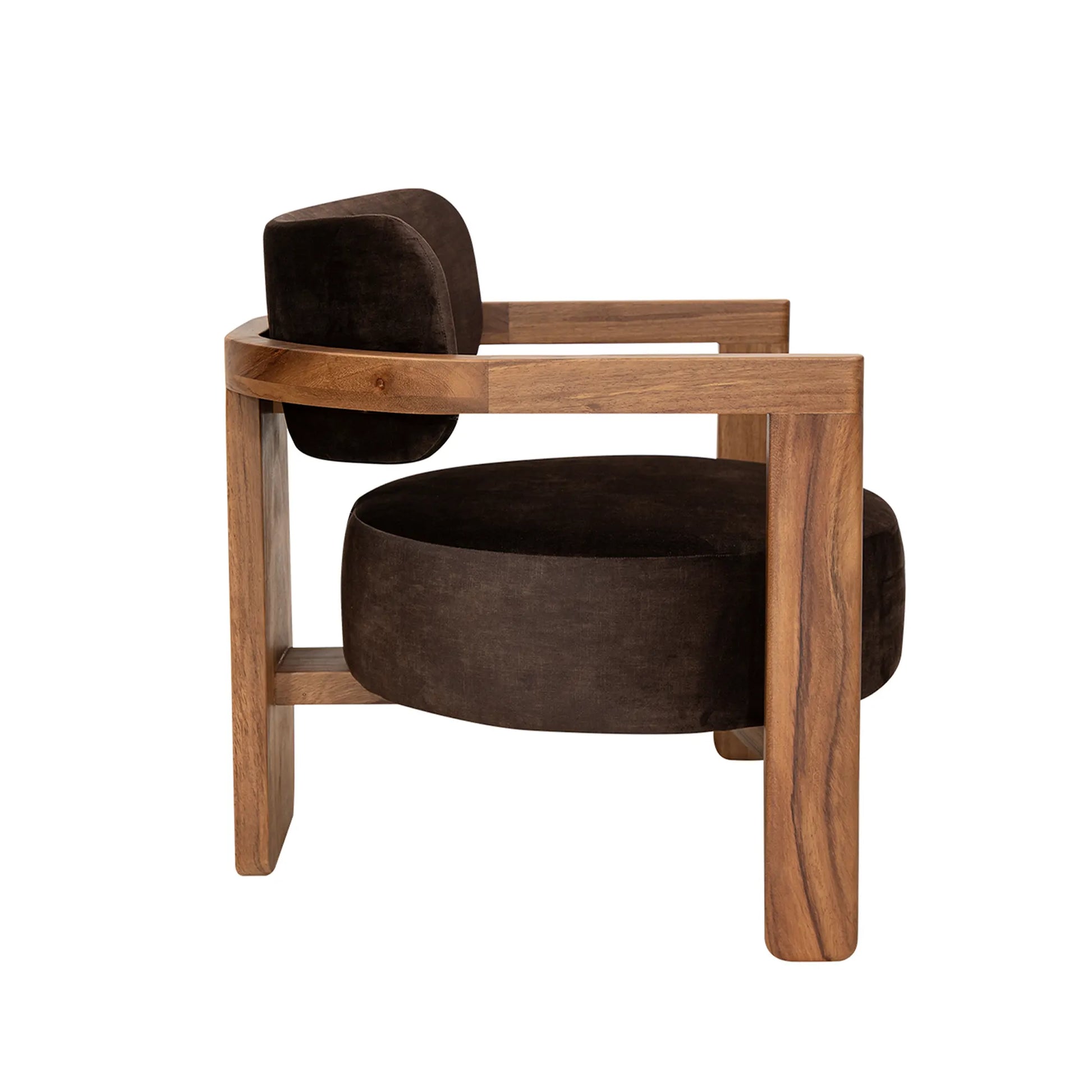 El Sillón Alexandria Color Chocolate es una pieza audaz que combina la solidez de la madera con la suavidad del terciopelo, creando un diseño con fuerte carácter mid-century y contemporáneo. Su estructura presenta un marco geométrico y robusto en madera cálida, con líneas gruesas y limpias que le otorgan una presencia escultórica. El contraste se encuentra en la tapicería: el asiento es un cilindro o disco de terciopelo en tono chocolate que evoca una sensación de lujo y confort. El respaldo, un cojín cilíndrico que se apoya sobre el marco de madera, completa el diseño, ofreciendo un soporte ergonómico y acentuando la estética Bauhaus. El Sillón Alexandria es perfecto como silla de acento en una sala, estudio u oficina, aportando un toque de elegancia táctil y diseño atrevido.