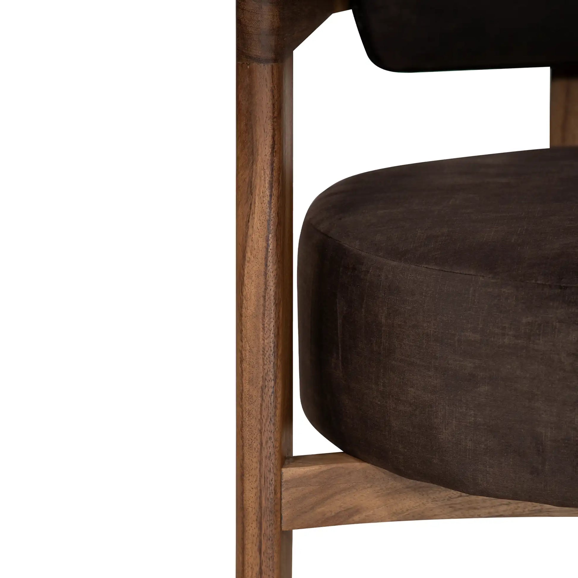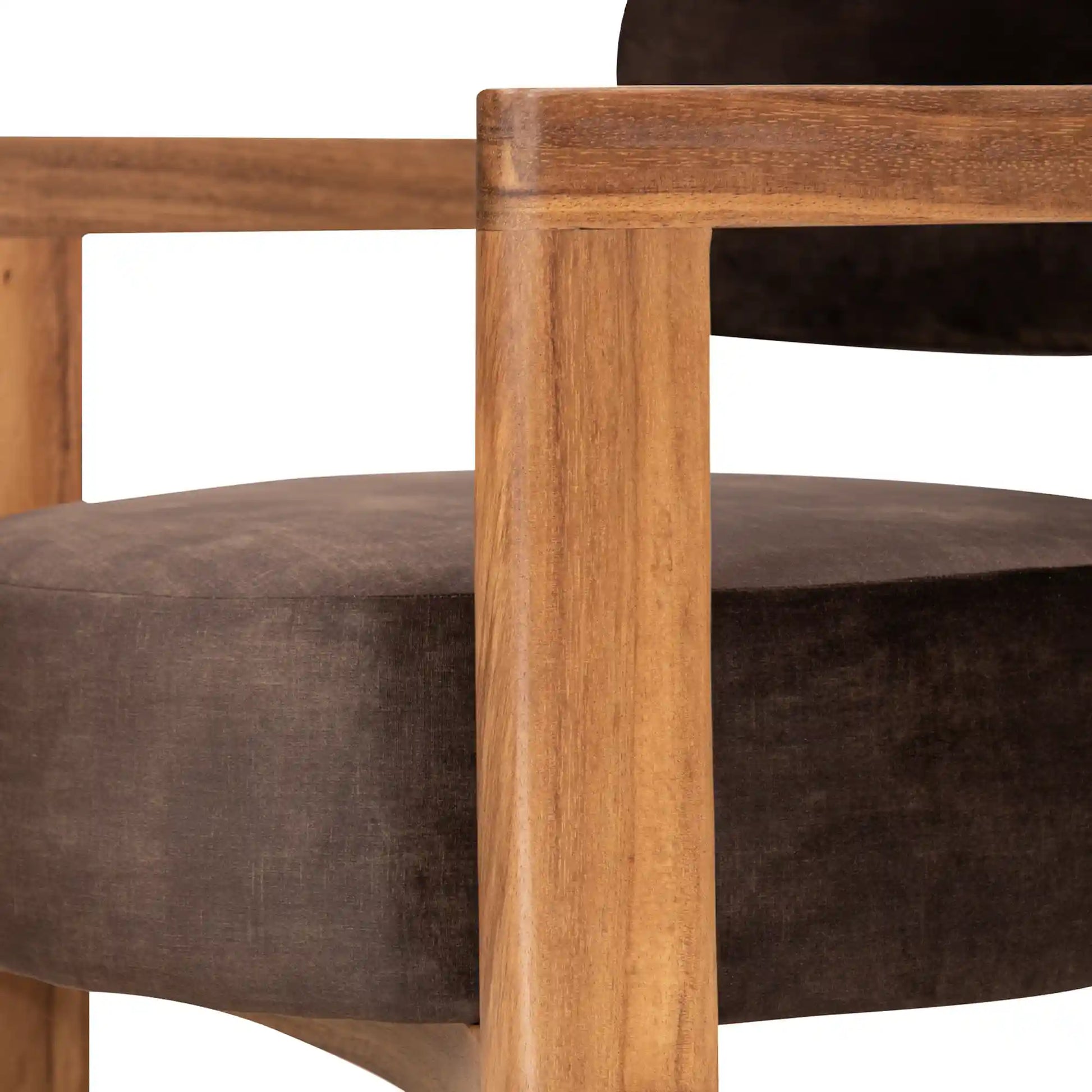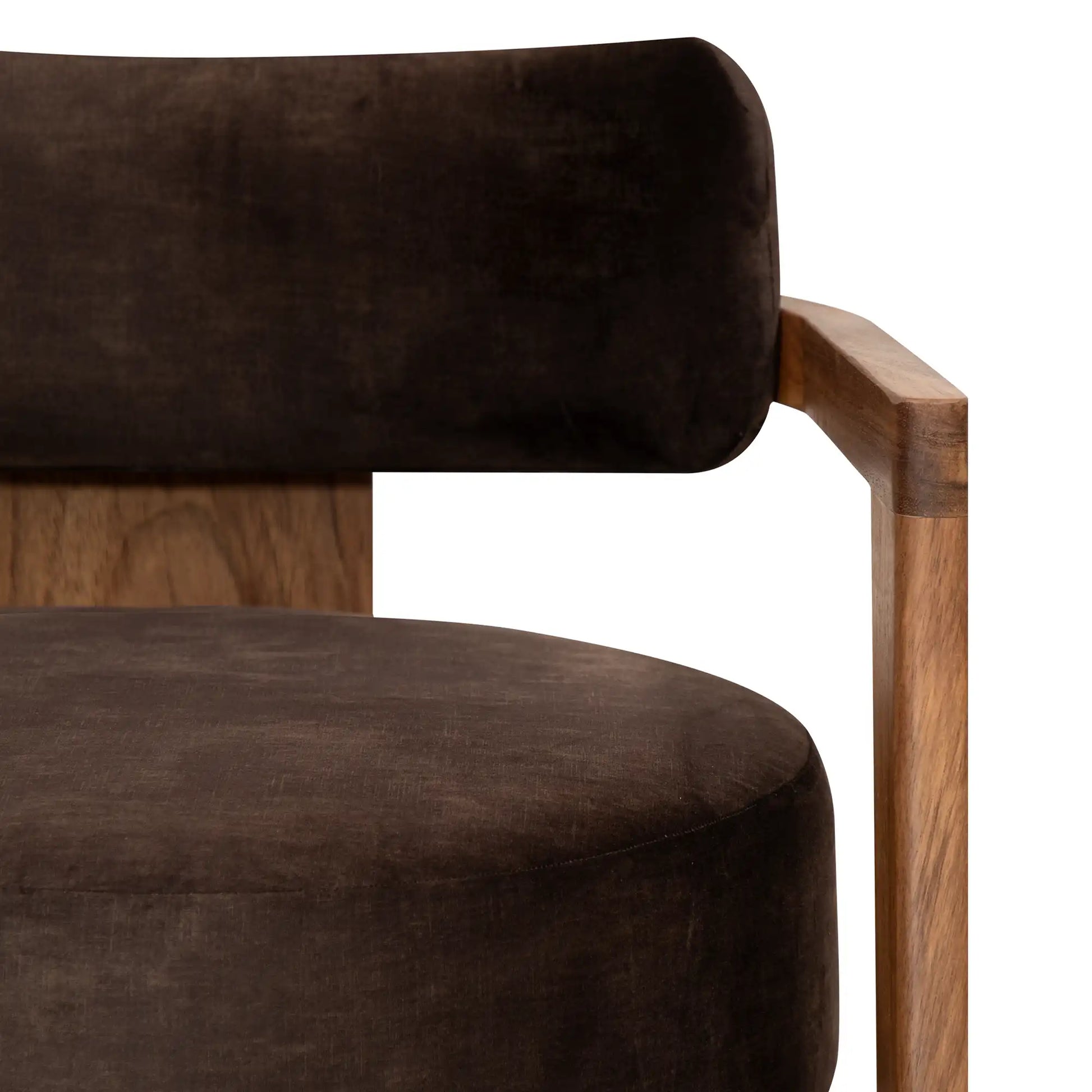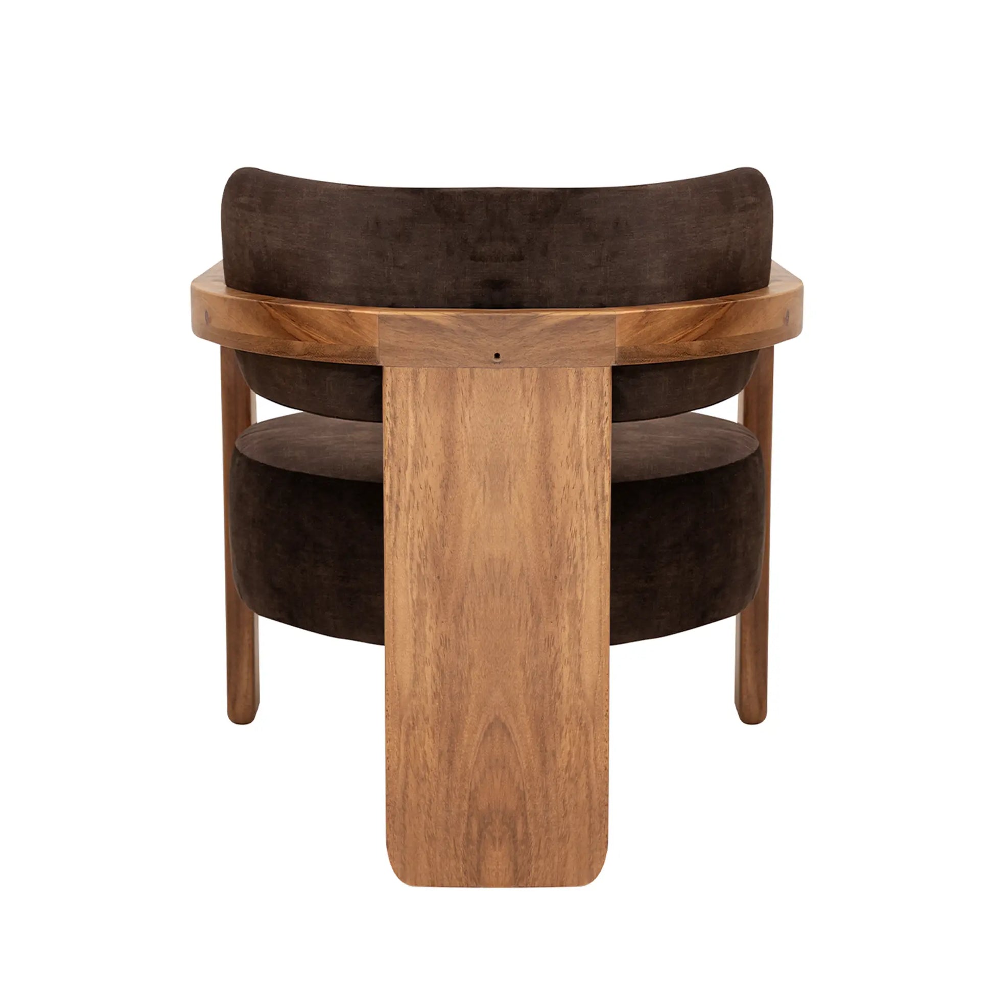 El Sillón Alexandria Color Chocolate es una pieza audaz que combina la solidez de la madera con la suavidad del terciopelo, creando un diseño con fuerte carácter mid-century y contemporáneo. Su estructura presenta un marco geométrico y robusto en madera cálida, con líneas gruesas y limpias que le otorgan una presencia escultórica. El contraste se encuentra en la tapicería: el asiento es un cilindro o disco de terciopelo en tono chocolate que evoca una sensación de lujo y confort. El respaldo, un cojín cilíndrico que se apoya sobre el marco de madera, completa el diseño, ofreciendo un soporte ergonómico y acentuando la estética Bauhaus. El Sillón Alexandria es perfecto como silla de acento en una sala, estudio u oficina, aportando un toque de elegancia táctil y diseño atrevido.