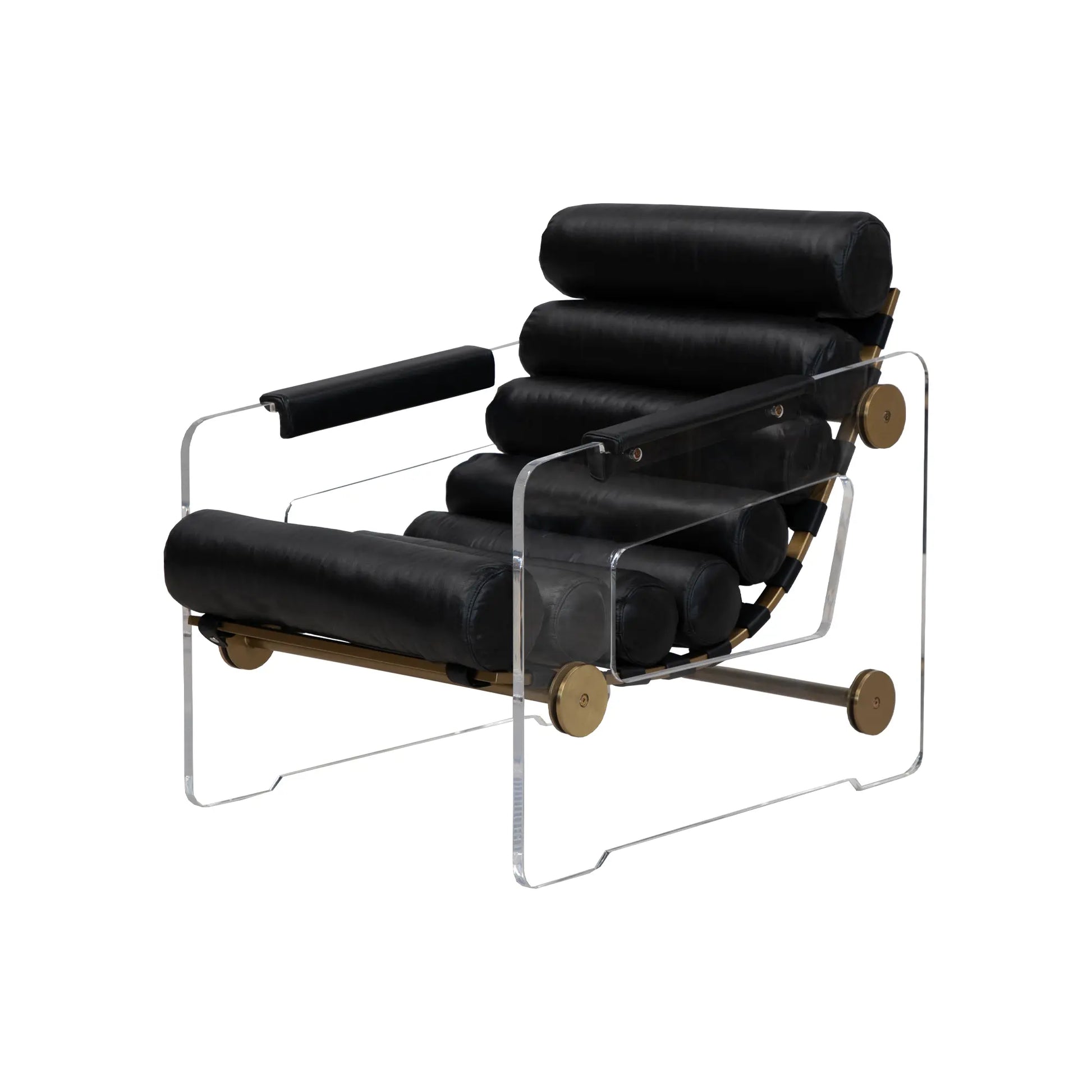 El Sillón P2024 Black es una pieza de diseño disruptivo que desafía las convenciones del mobiliario tradicional, fusionando la estética mid-century modern. Su estructura es una exhibición de transparencia y fuerza: los laterales de acrílico cristalino de gran grosor permiten que el sillón flote visualmente en el espacio, revelando un complejo sistema de soporte interno. El asiento y el respaldo están formados por una serie de cilindros acolchados tapizados en un cuero de grano superor, que se adaptan dinámicamente al cuerpo ofreciendo una experiencia de descanso única. Esta pieza es la elección definitiva para coleccionistas y amantes del diseño que buscan una pieza de acento icónica.
