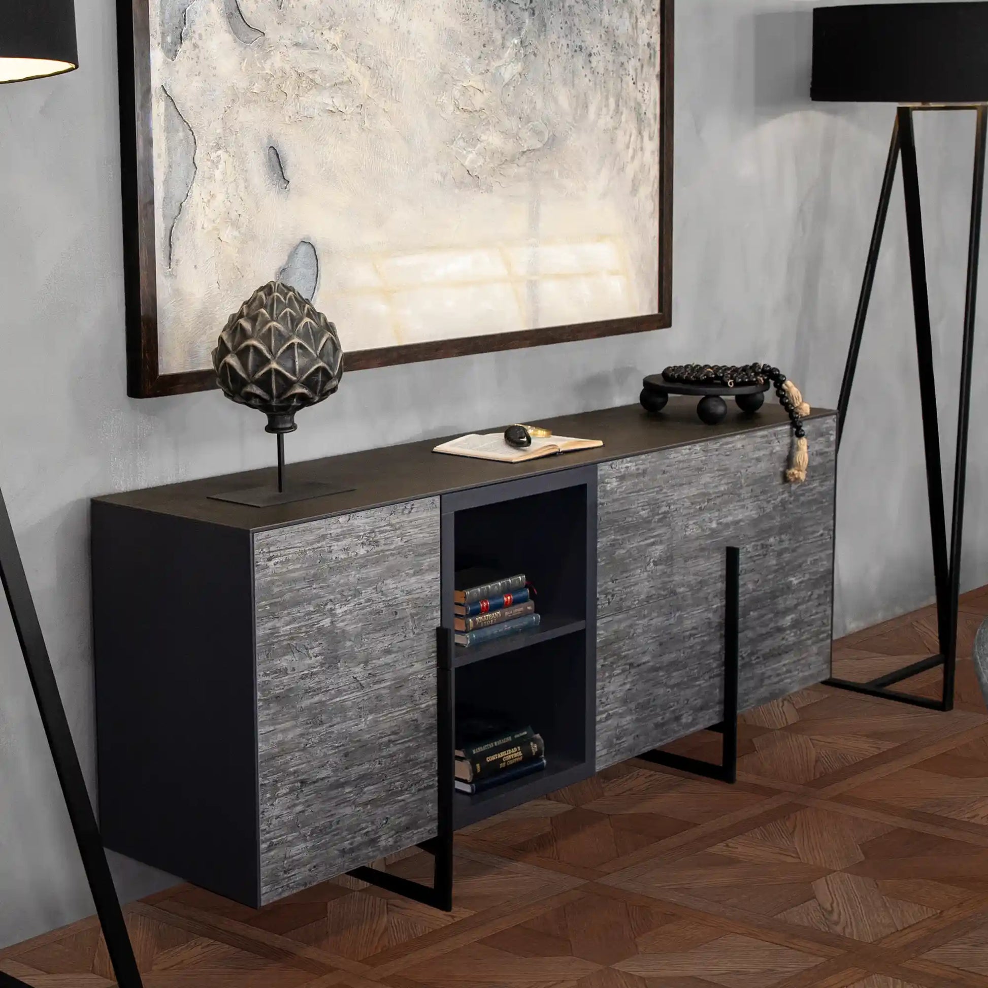 Con un diseño elegante y contemporáneo, el Buffet Westbourne presenta una mezcla de materiales que destaca su carácter industrial y sofisticado. Las puertas y tienen una cubierta de cerámica proveniente de España e Italia, creando un contraste atractivo con la estructura en negro mate. Este juego de colores y texturas le da al buffet un aspecto robusto pero refinado. El buffet cuenta con un amplio espacio de almacenamiento, con compartimentos cerrados para mantener organizados los objetos y estantes abiertos que son ideales para exhibir piezas decorativas. Las patas metálicas en forma de marco no solo proporcionan estabilidad, sino que también añaden un toque de diseño geométrico que eleva la estética general del mueble. Una pieza ideal para amantes de lo único.