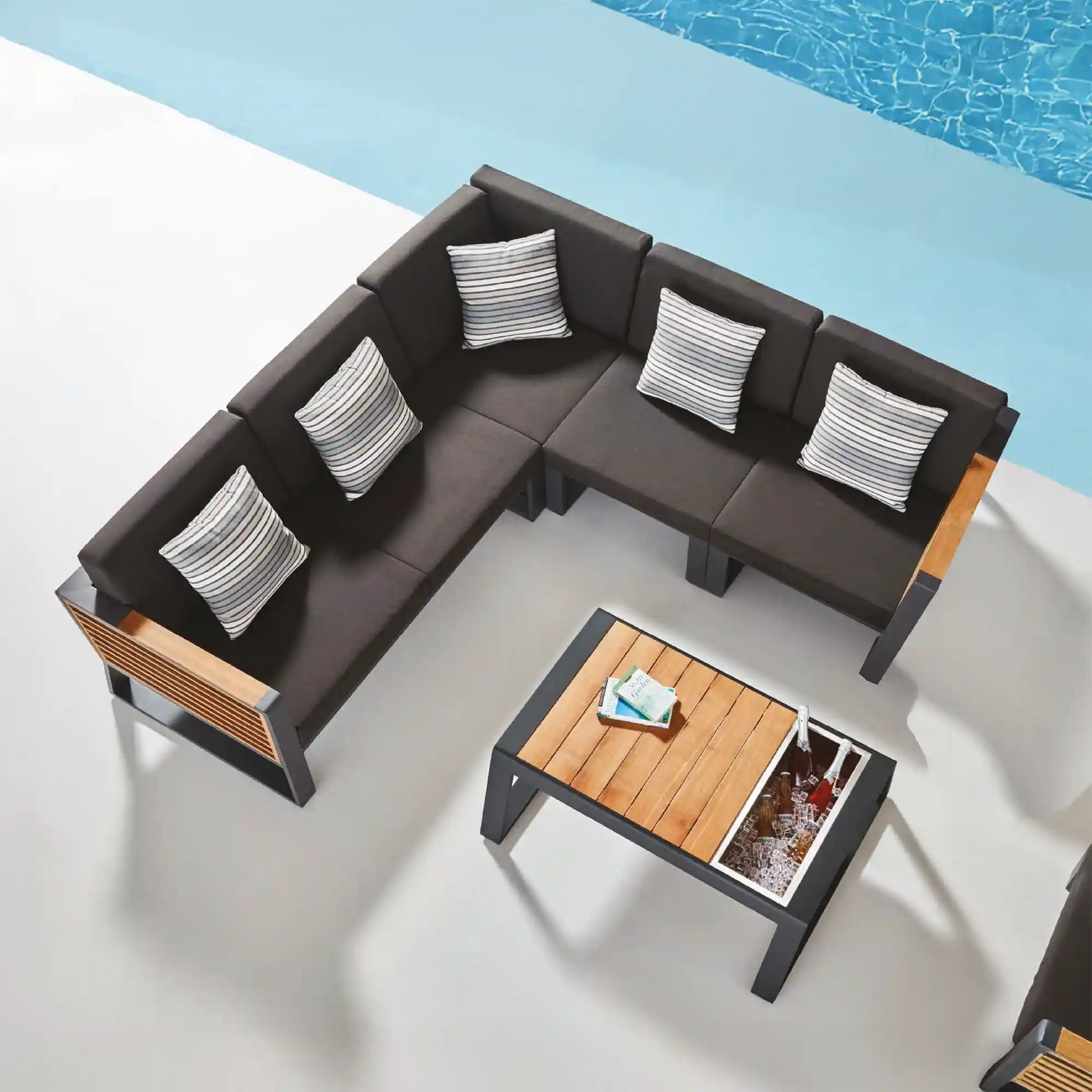 Transforma tu espacio exterior en un refugio de estilo y confort con la Sala En Escuadra York. Este conjunto no solo captura la esencia del diseño contemporáneo, sino que también introduce una fusión única de materiales que evocan tanto modernidad como calidez. La estructura de aluminio en tono oscuro aporta un carácter robusto y elegante, mientras que los detalles en madera natural en los brazos añaden un toque orgánico que contrasta de manera sofisticada con las líneas rectas y angulares del diseño. Los cojines, cuidadosamente seleccionados en tonos neutros, ofrecen un equilibrio perfecto entre comodidad y resistencia, adaptándose sin esfuerzo al entorno exterior. La mesa de centro, con una pequeña hielera incluida, se convierte en el complemento ideal, ofreciendo funcionalidad y estilo en igual medida. La sala en escuadra york es perfecta para crear momentos memorables en compañía.