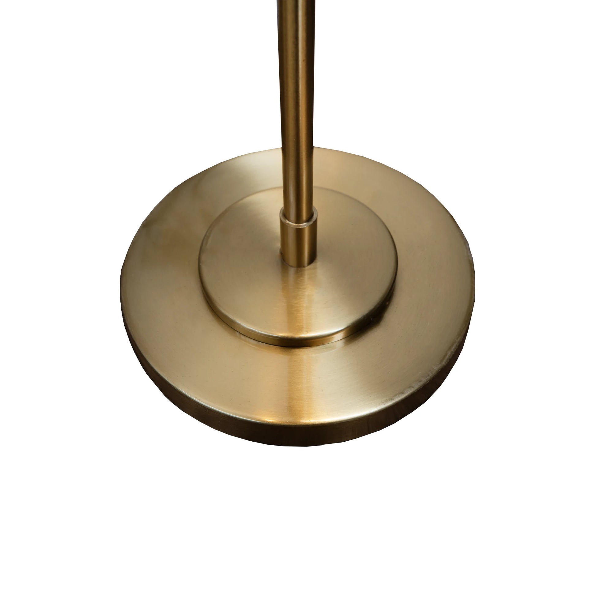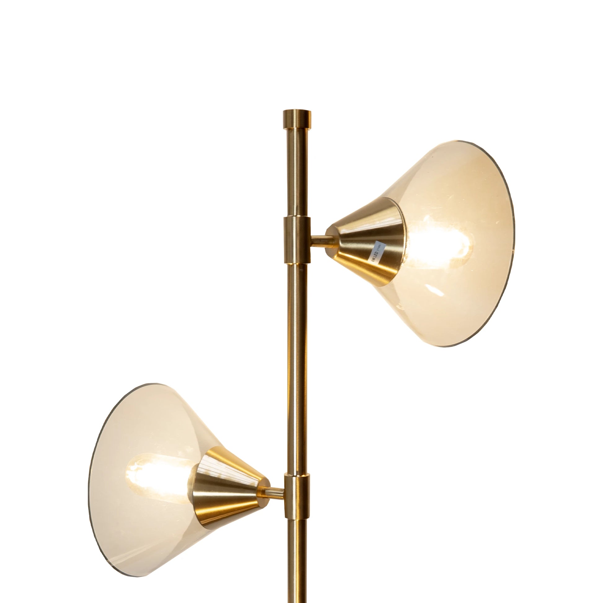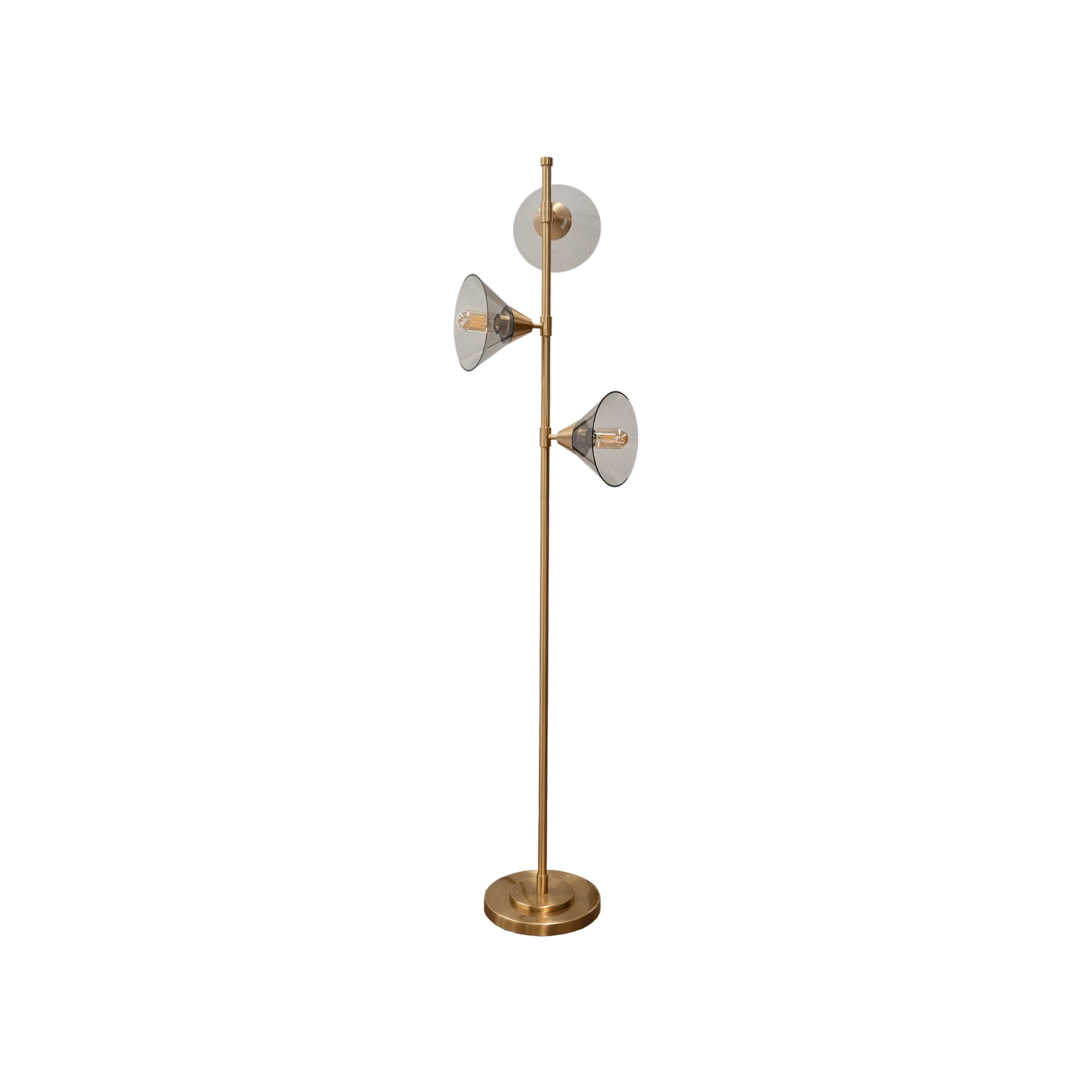 La Lámpara Vértice es una pieza de iluminación de pie que combina la rigidez de las líneas metálicas con la suavidad del vidrio artesanal. De su eje central emergen de forma asimétrica tres pantallas de cristal: dos en forma de conos estilizados y una esfera traslúcida, distribuidas a diferentes alturas para proyectar la luz en múltiples ángulos y crear un juego dinámico de sombras y reflejos.
