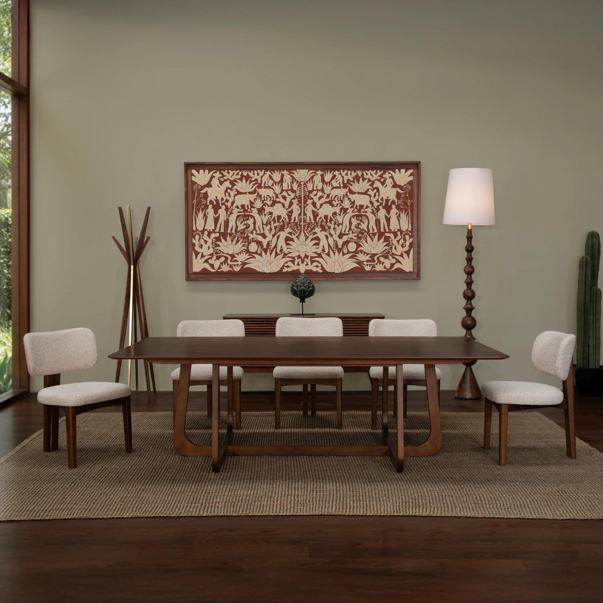 La Mesa Comedor Sevilla es una pieza que rinde homenaje a la elegancia orgánica del diseño mid-century con una silueta moderna y atemporal. El foco de diseño reside en su base escultural, compuesta por dos pedestales en forma de "U" invertida y curvada. Estas patas se unen en la parte inferior con un travesaño central, creando un patrón dinámico que evoca ligereza y fluidez. Mientras tanto, su cubierta posee un juego de vetas en un diseño geométrico que llevan el diseño mid-century a otro nivel. El Comedor Sevilla es la elección perfecta para quienes buscan un diseño sofisticado, orgánico y funcional que se convertirá en la pieza central de cualquier reunión.