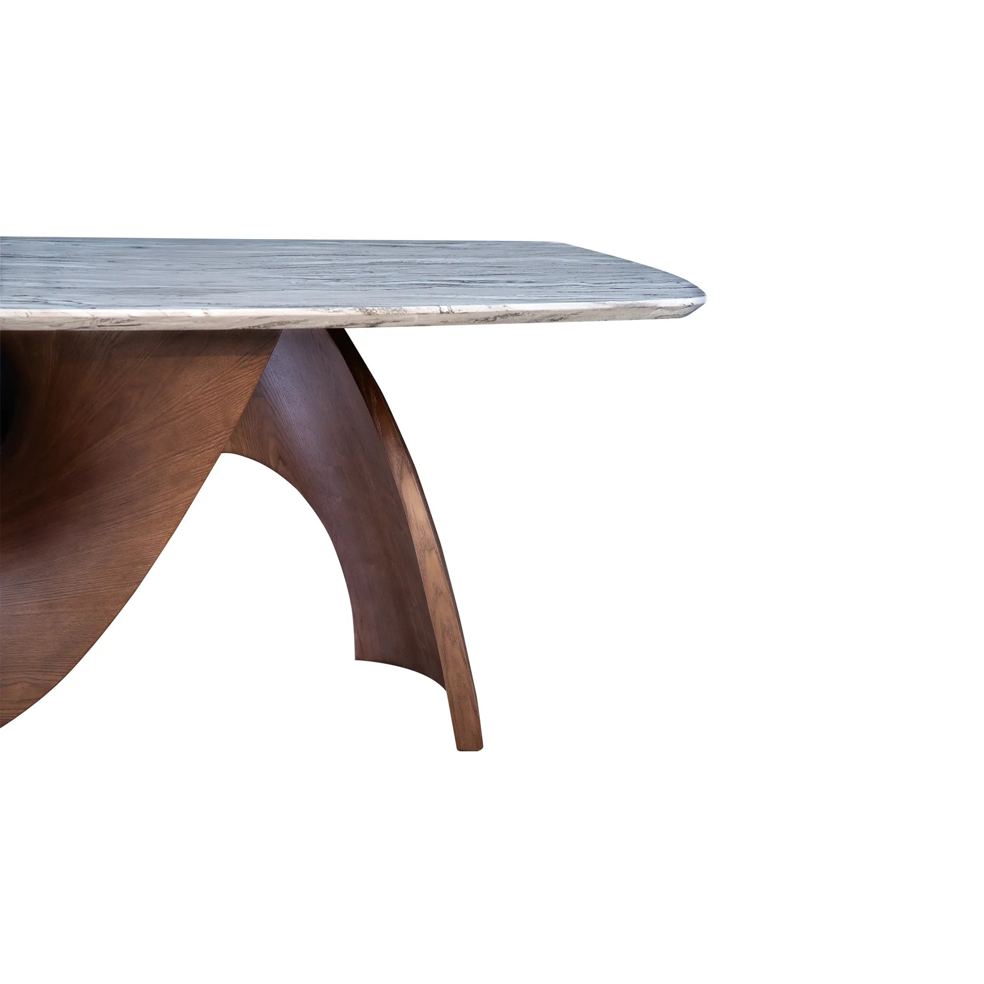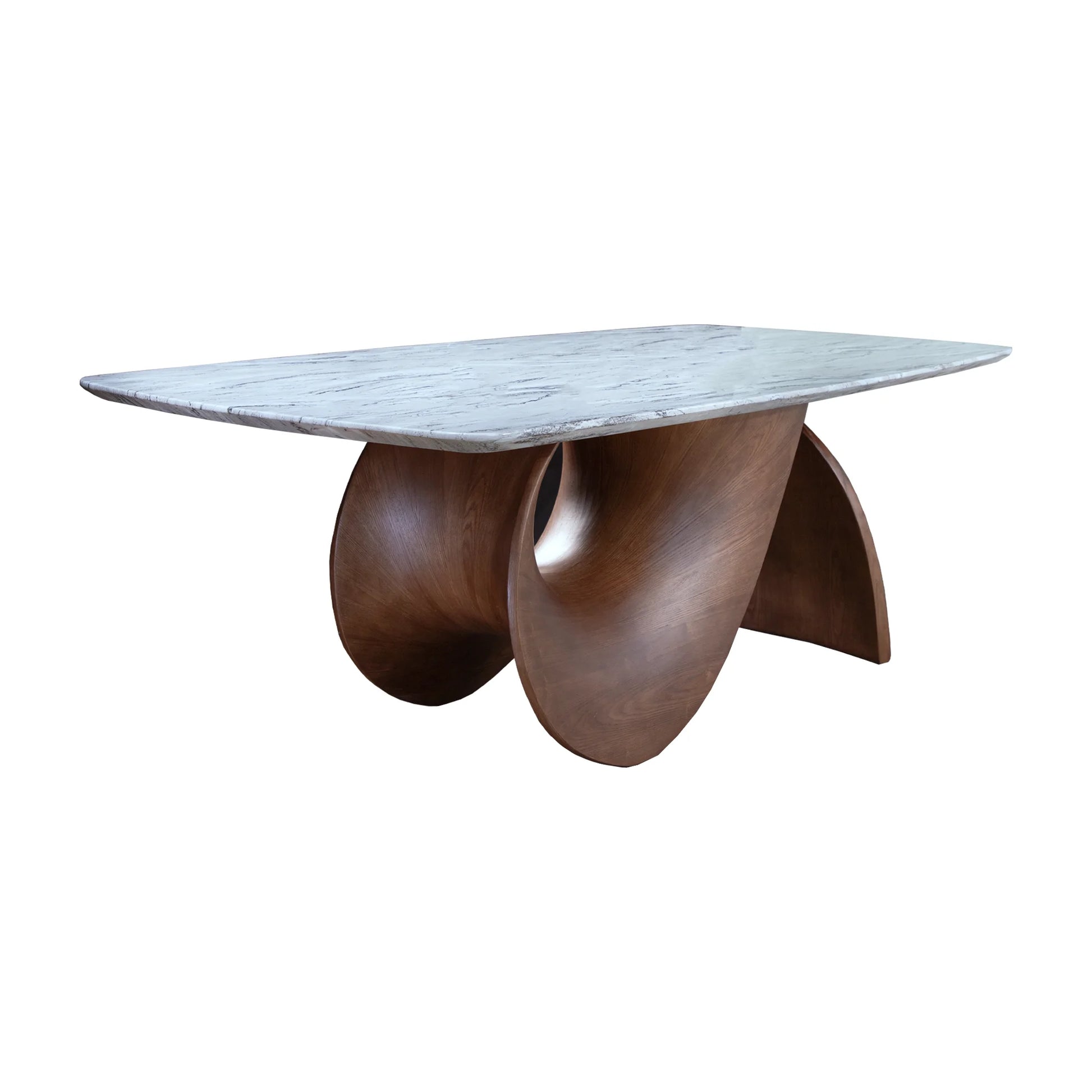 La Mesa Comedor Careyes es la culminación del diseño de alta gama, donde la funcionalidad se convierte en una expresión artística de movimiento. La base presenta una forma curva, dinámica y fluida, con un gran orificio central que crea un espacio negativo. Esta forma orgánica, que recuerda a una ola, confiere un dramatismo inigualable y un sentido de ligereza sorprendente para su volumen. El contraste entre la calidez de la madera tallada y la solidez fresca de la cubierta de mármol industrializado hace de la Mesa Comedor Careyes una obra maestra de diseño que dominará cualquier espacio con su sofisticación y audacia.